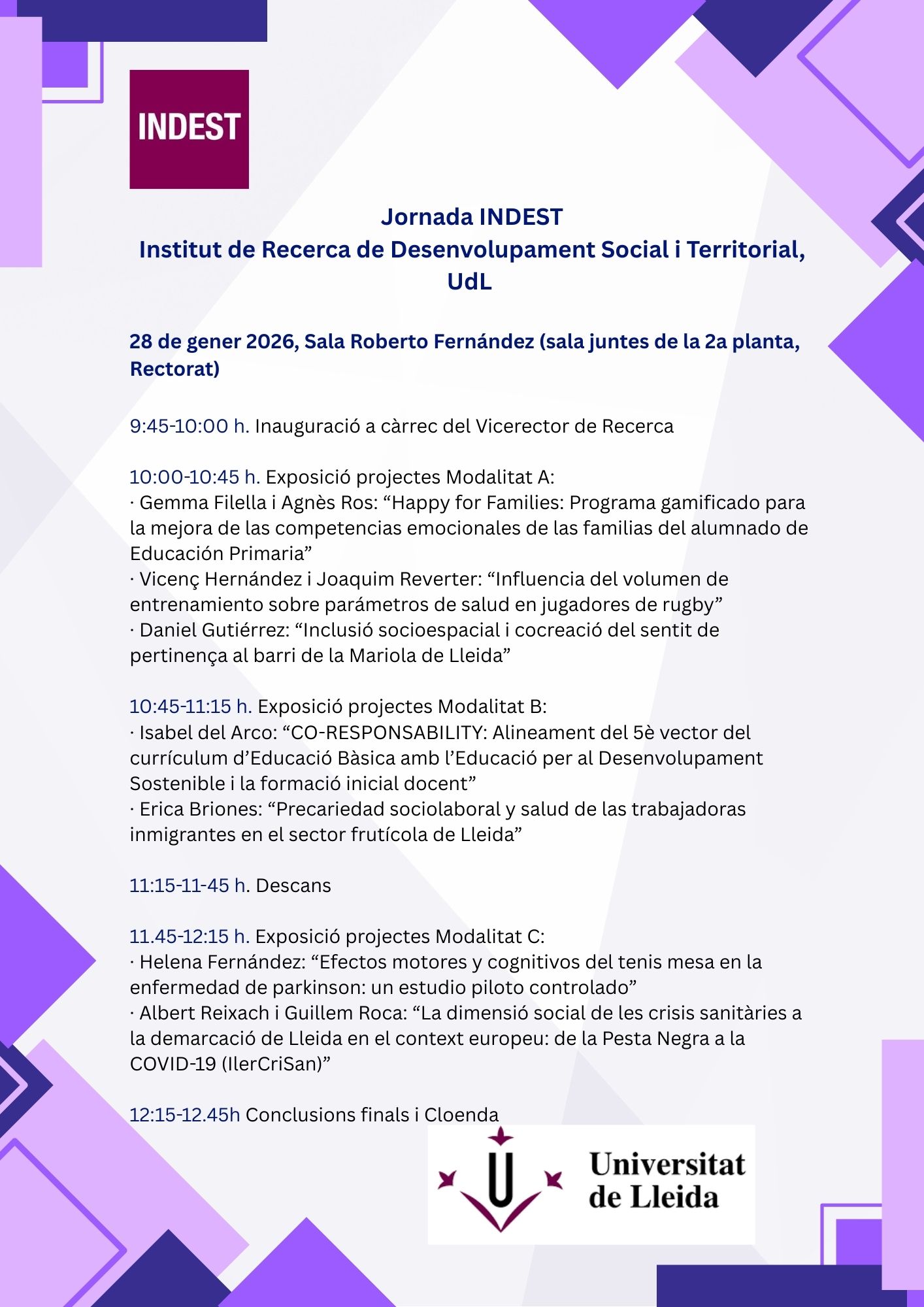 Descarregar PdfEl proper 28 de gener de 2026 tindrà lloc la Jornada Anual de l'INDEST, en la que es presentaran els resultats dels projectes seleccionats a la Convocatòria 2023 d'ajuts de l'INDEST.